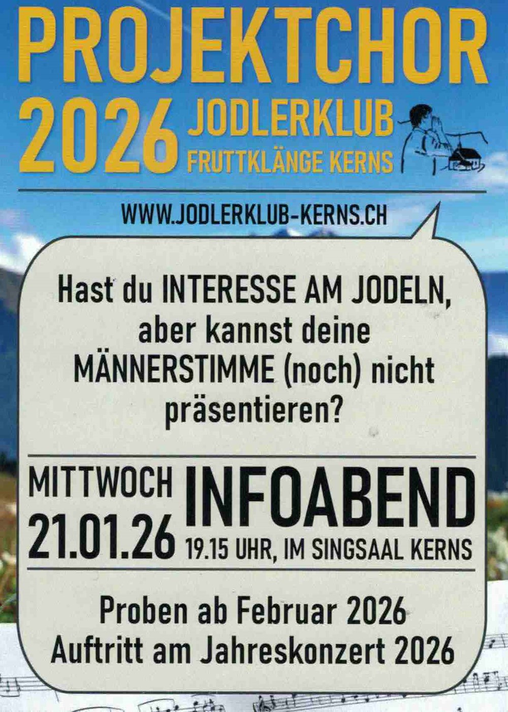 Du hast Interesse am Jodeln und findest Deine Männerstimme präsentabel aber noch nicht richtig ausgereift? Am Mittwoch, 21. Januar hast Du die Möglichkeit, Deine Stimme am Infoabend zu präsentieren.
